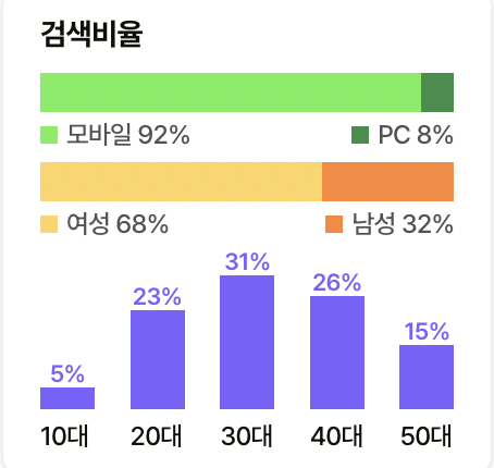 여기서는 30~40대 여성이 주요 타켓층인데요, 서로 결과가 다르죠? 왜 다를가요? 이유는 판다랭크는 최근 6개월 평균 검색 현황이고, M-자비스는 최근 1개월의 검색 현황입니다. 최신 자료가 필요하시면, M-자비스를 이용하시는걸 추천드립니다.  참고로, M-자비스에서 검색량, 광고 단가 등 여러가지 다른 정보도 확인이 가능하니 꼭 설치하시고 이용해 보세요. (이해관계 1도 없습니다.^^)