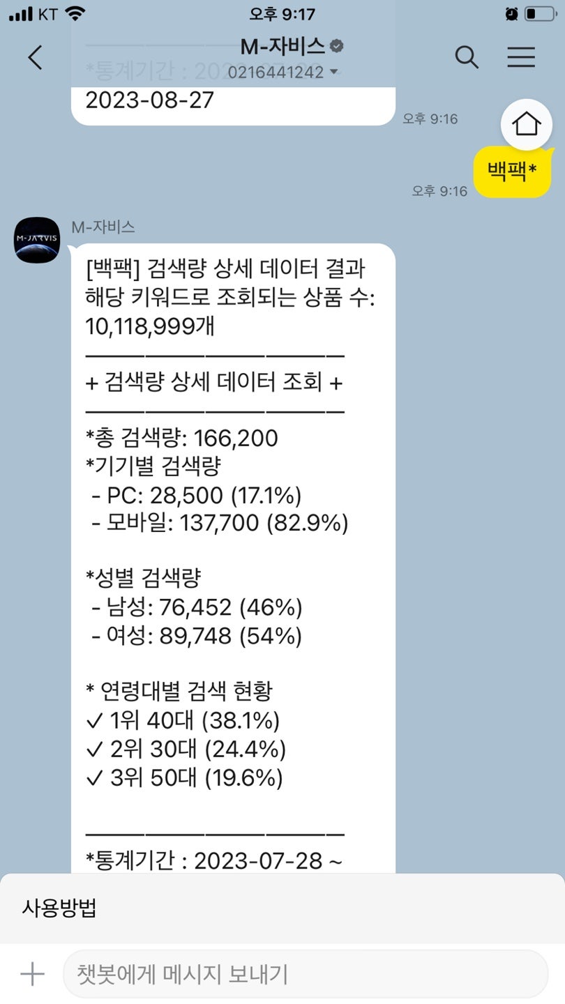 아이템스타우트나 판다랭크에서 내 상품의 수요층을 먼저 파악합니다. 예시로, 판다랭크에서 키워드분석에서 '백팩'을 검색해 봤습니다. 주요 타겟층이 20~40대 여성입니다. 그리고, 핸드폰으로도 간편하게 타겟층을 확인할 수 있는 방법이 있습니다. 바로, M-자비스를 이용한 방법입니다.카톡에서 '자비스'를 친구로 추가한 후, 채팅창에 백팩* 이렇게 입력하시면 결과를 바로 확인할 수 있습니다.