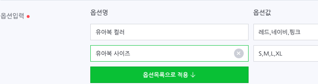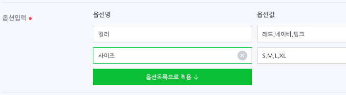 상품 등록 화면에서 옵션 설정 시 옵션명에 노출시키고 싶은 키워드도 같이 넣어주세요.