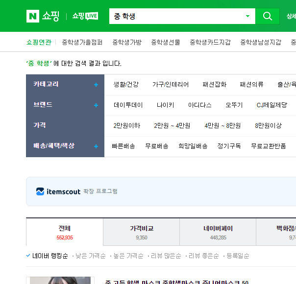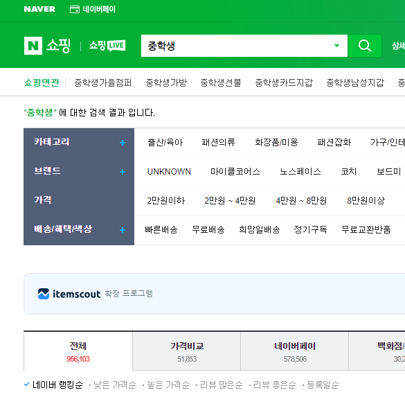 중학생 붙여 쓴경우 검색량 956,103 / 중 학생 띄어 쓴경우 검색량 552,905